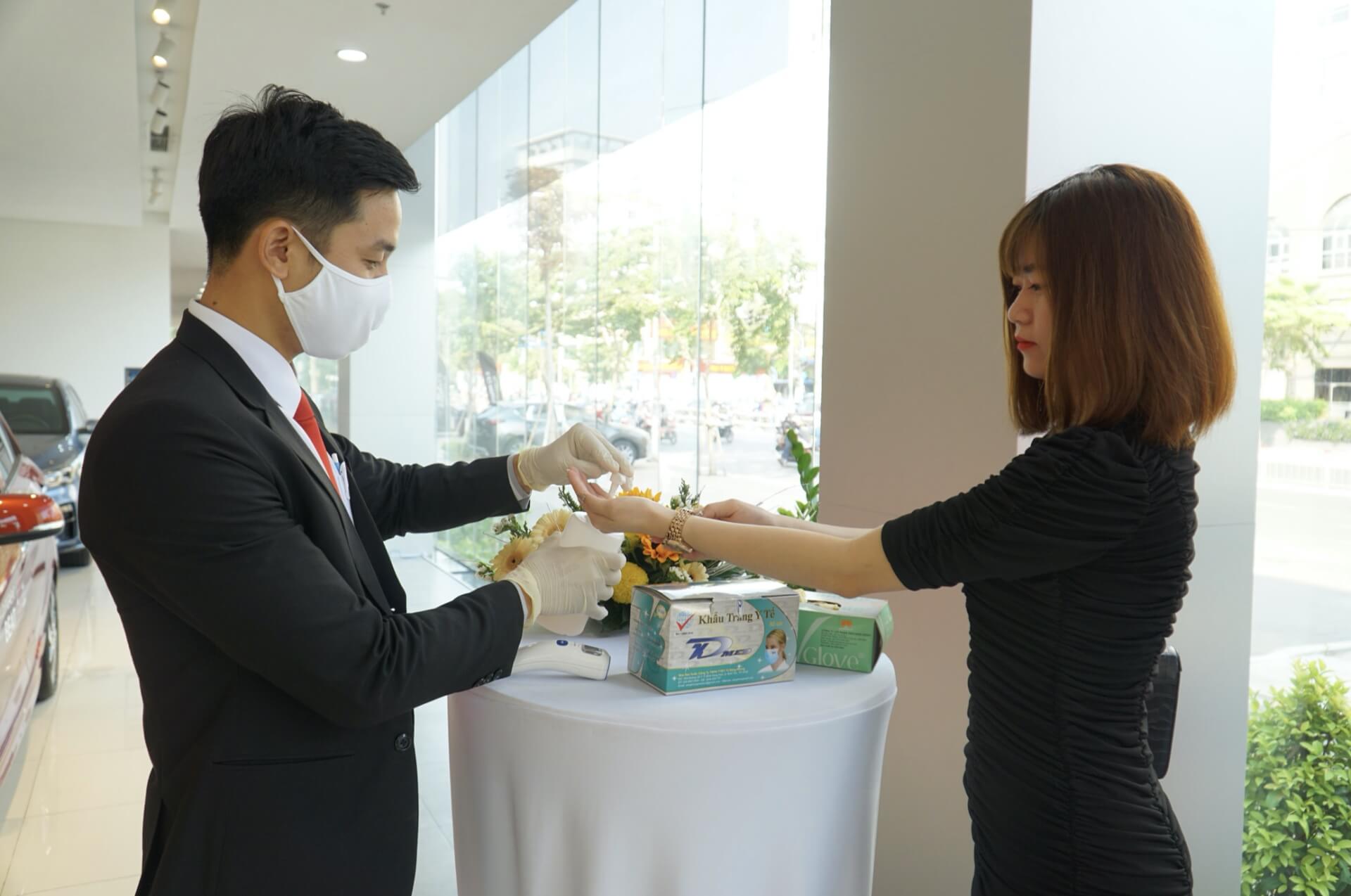 Tư vấn viên của Kia Việt Nam sẽ đón tiếp khách hàng tại cửa ra vào của showroom. Sau đó, khách hàng sẽ được rửa tay bằng nước diệt khuẩn, được cung cấp miễn phí và khuyến nghị sử dụng khẩu trang, găng tay cao su trước khi bước vào khu vực trưng bày và trải nghiệm xe. Đối với khách đến sử dụng các dịch vụ bảo hành, bảo dưỡng xe, đại lý cũng áp dụng cách tương tự.
